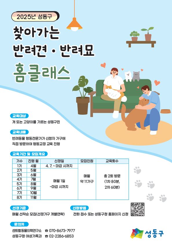 ○ 신청방법: 온라인 접수(성동구 반려동물 온라인 학교) 또는 유선 신청(070-8673-7977)